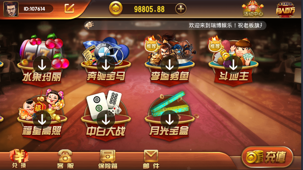 admin 1:1游戏 游戏源码 精品亲测 2020-05-09 瑞博娱乐 完美运营版 代理完整 带微信登录和手机登录 短信 支付 源码程序下载 最新瑞博娱乐运营版棋牌组件 游戏介绍 完整瑞博娱乐运营级别。代理完整!带微信登录和手机登录 短信 支付 内含游戏: 百人场: 金鲨银鲨、红黑大战、龙虎斗、奔驰宝马、中白大战、百人牛牛、百家乐 捕鱼场:疯狂捕鱼、李逵劈鱼 拉霸场:水果玛丽、福星高照、月光宝盒、财神到 扑克场:炸金花、斗地主、三公、抢庄牛牛 演示截图 瑞博娱乐